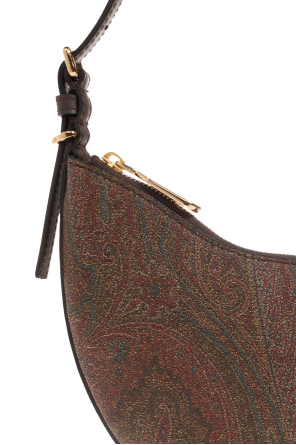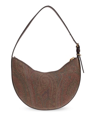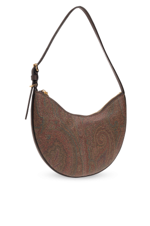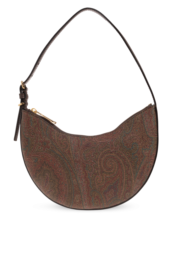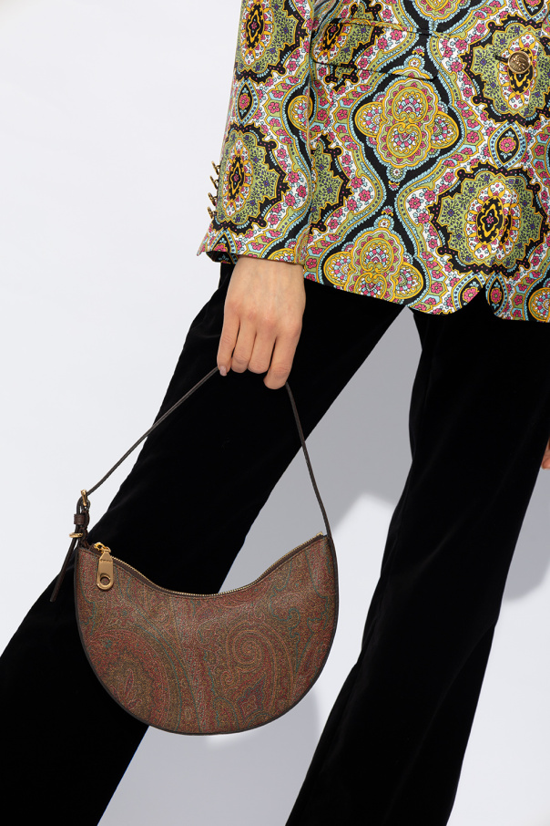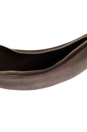 Etro的多彩Hobo小号流浪包。采用彩色带paisley图案的涂层帆布制成。棕色小牛皮饰边。拉链闭合。可调节的半圆形单肩带。内部设有一个主隔层。金色金属配件。