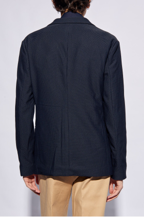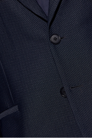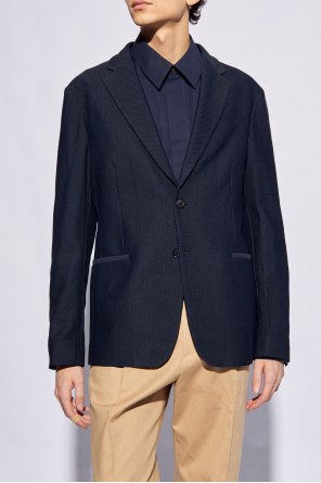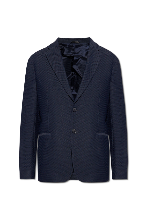 Giorgio Armani的深蓝色平驳领西装外套,纽扣开合。正面设有两个口袋。长袖。