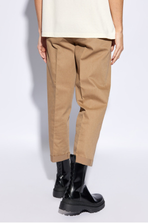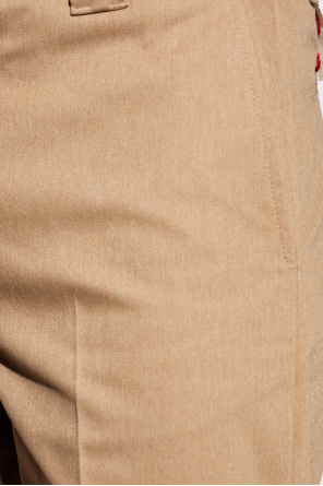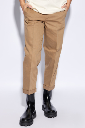 Golden Goose的棕色奇诺裤,配有拉链、纽扣和钩扣开合。后面饰有红色标志贴花。四个口袋:三个插袋和一个纽扣口袋。略锥形、翻边裤腿。