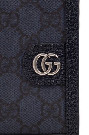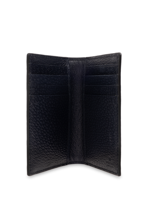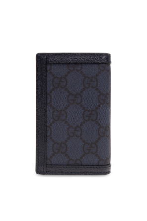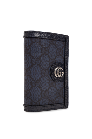 Navy blue folding card case from Gucci. Made of ‘GG Supreme’ canvas and leather, this item is embellished with a silver-tone metal logo plaque on the front and features two slip pockets and eight card slots.
