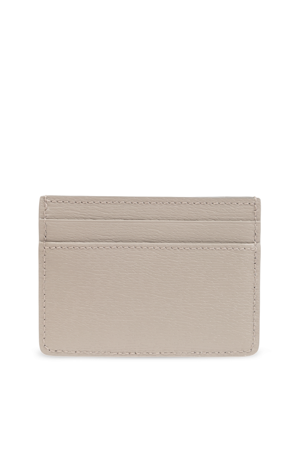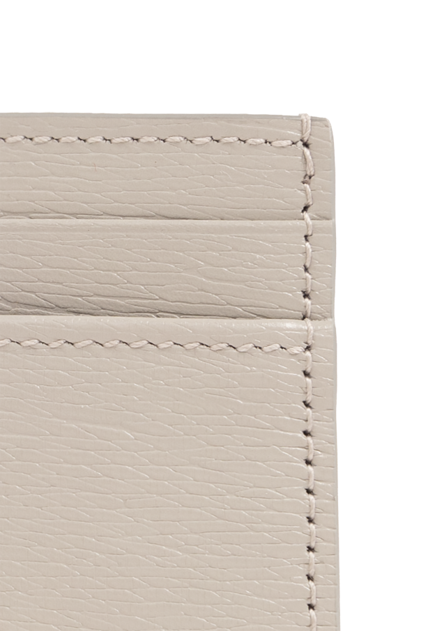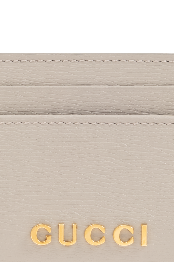 Grey card case from Gucci. Made of leather, this item showcases a gold-tone metal logo plaque on the front, four card slots and one slip pocket.