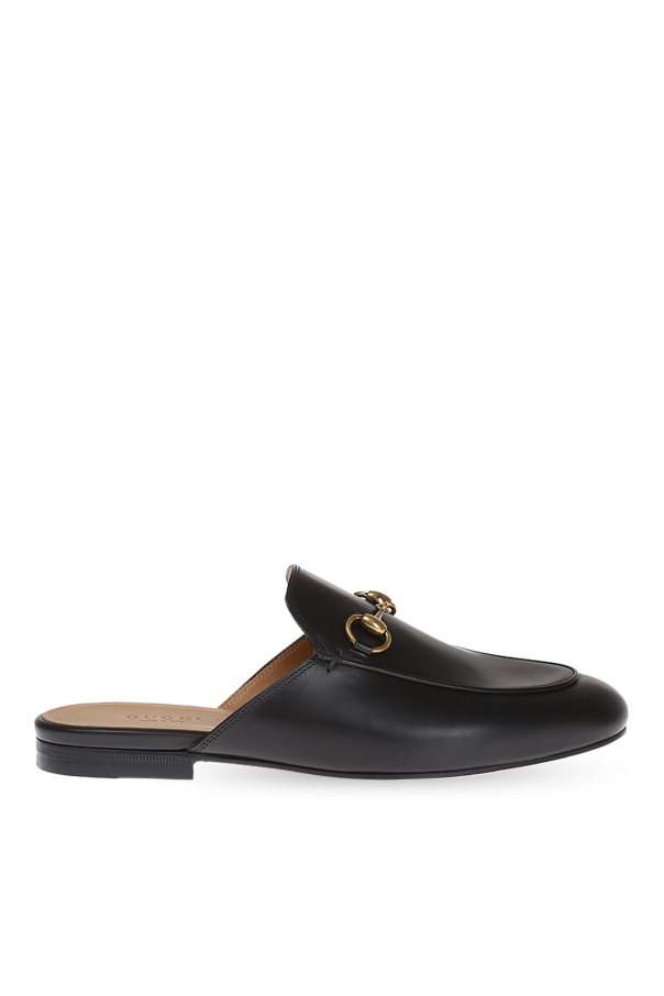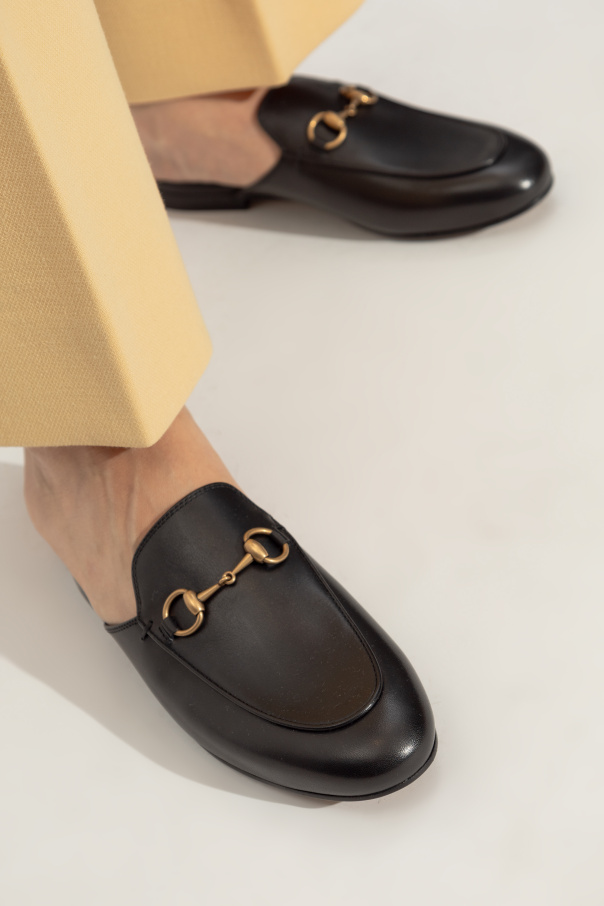 Gucci的黑色皮革拖鞋。饰有标志性金色调的金属马衔。米色皮革鞋底。