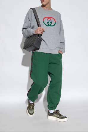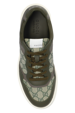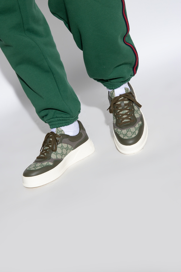 Gucci的绿灰色运动鞋,系带设计。采用皮革和面料制成。饰有GG单字母徽标图案。灰色橡胶外底。