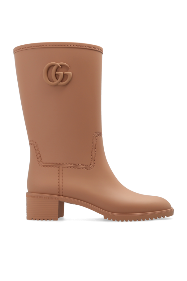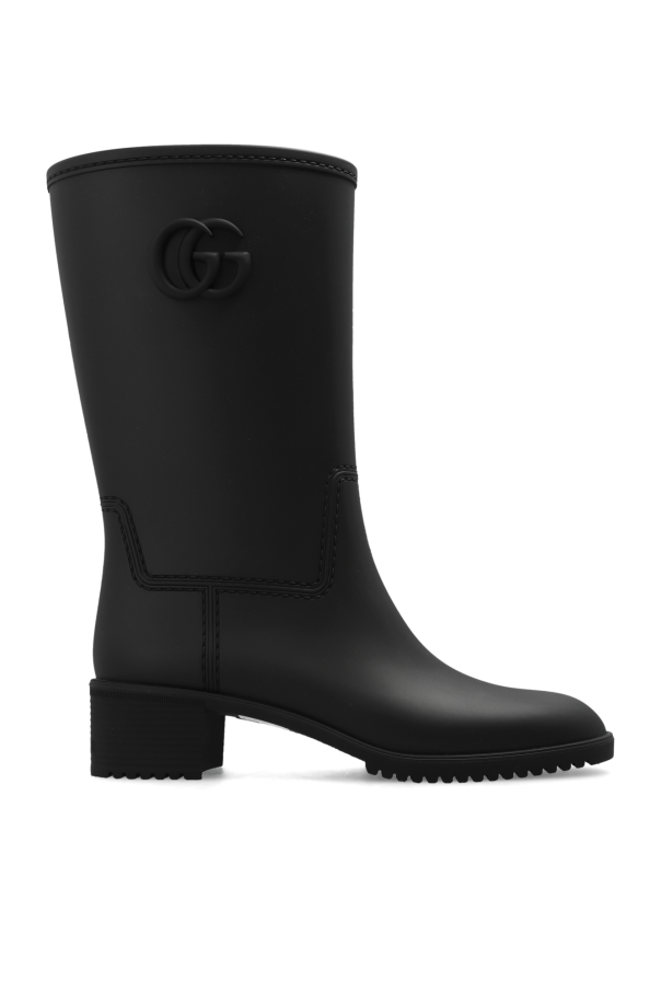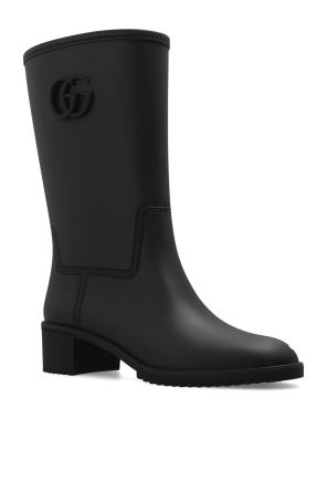 Black heeled rain boots from Gucci. Sitting on a black rubber sole, this model showcases a tactile logo on the side.