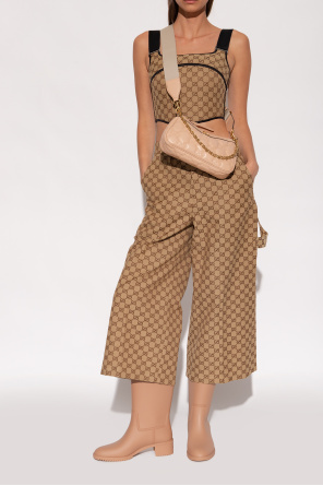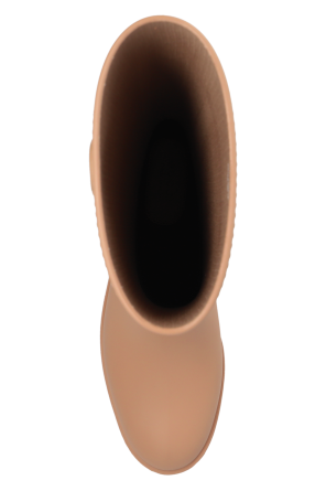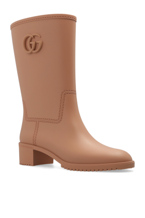 Blush pink heeled rain boots from Gucci. Sitting on a blush pink rubber sole, this model showcases a tactile logo on the side.
