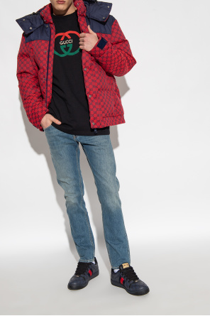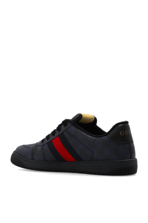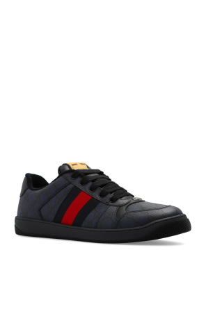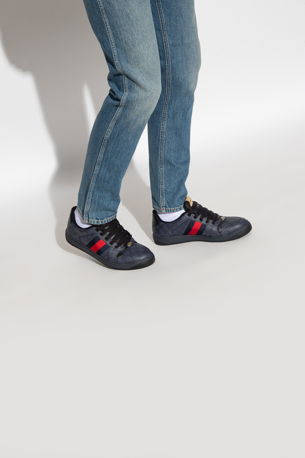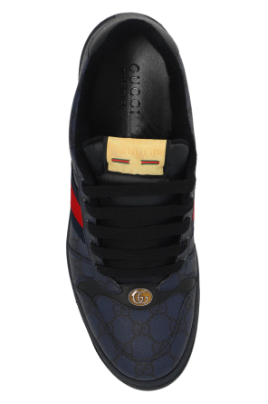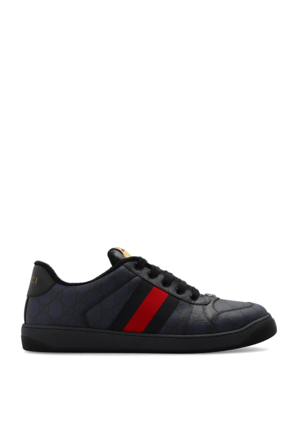 Gucci的深蓝色Screener系列帆布和皮革运动鞋,系带设计。前部饰有标志贴花。侧面配有深蓝红深蓝Web条纹。黑深蓝橡胶鞋底。