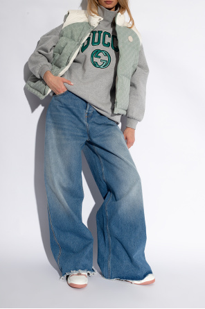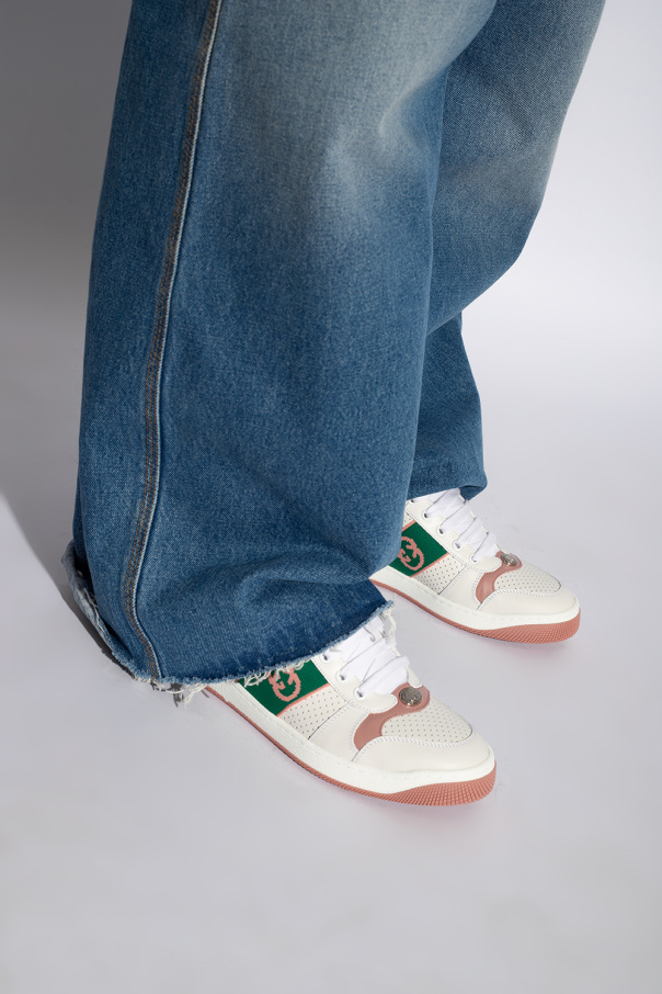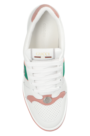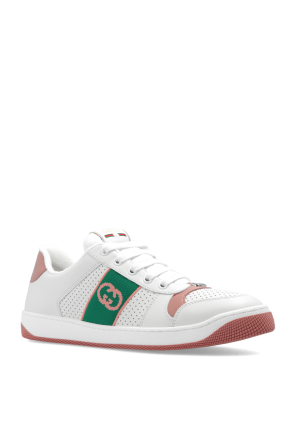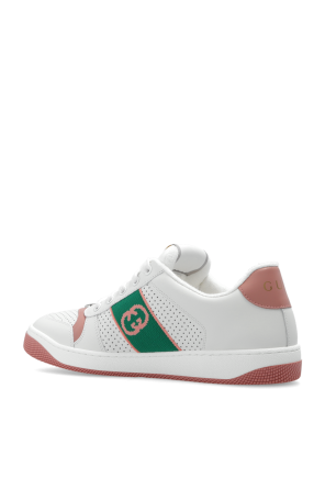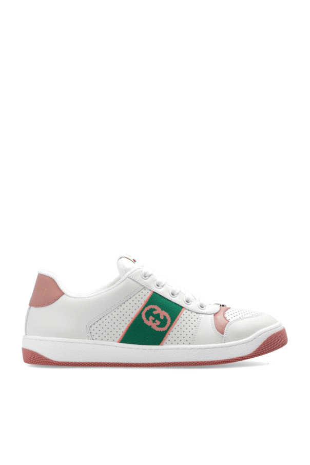 Gucci的白绿粉色运动鞋,采用皮革和面料制成。饰有鞋面的穿孔细节、带有品牌字母图案的饰带和标志。粉色橡胶外底。