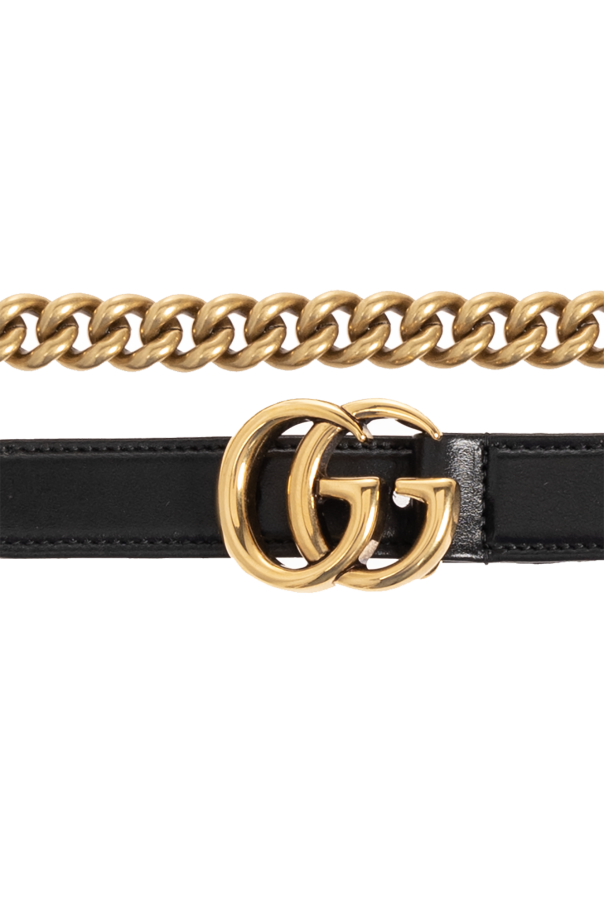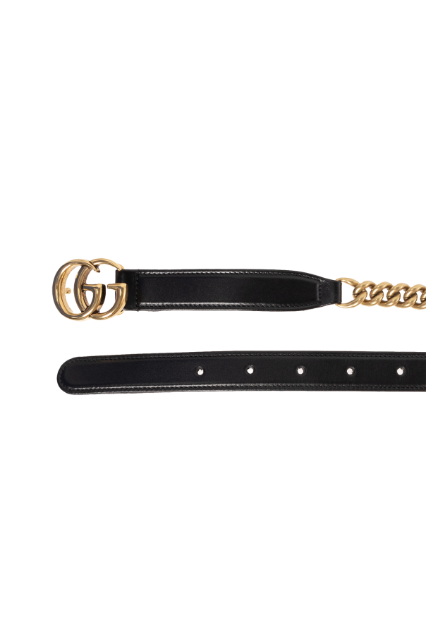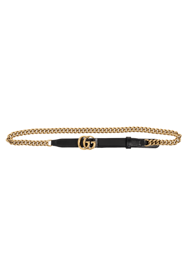 Black belt from Gucci. Made from calf leather and brass chain, this item features an antiqued gold-tone ‘Double G’ buckle.