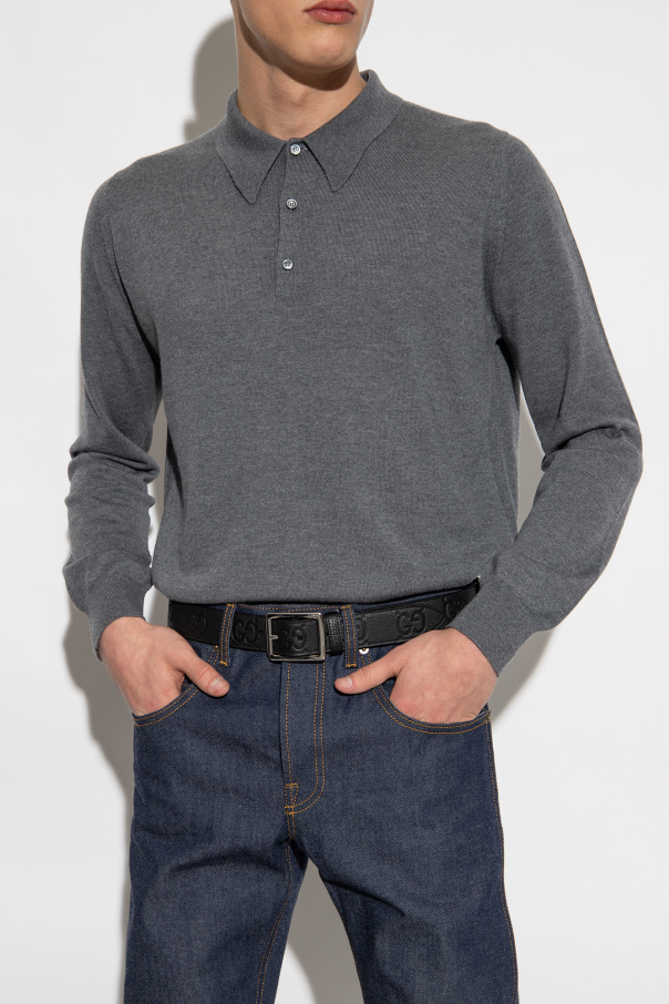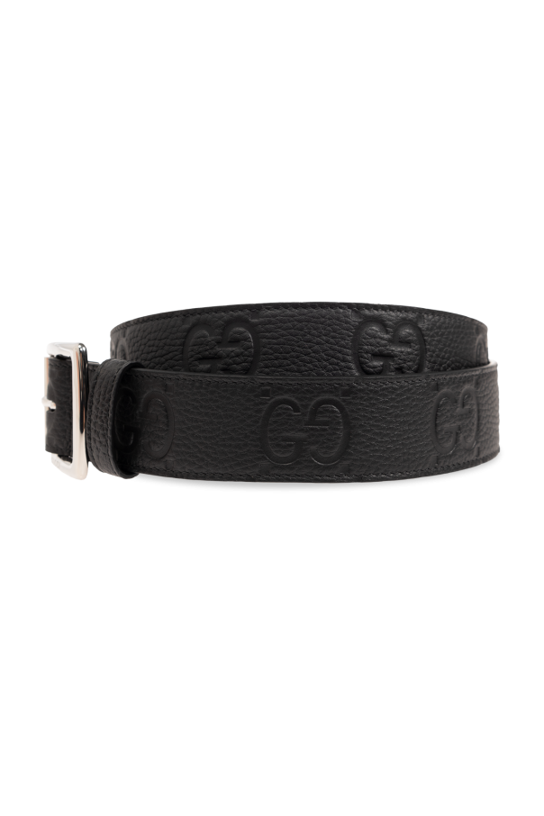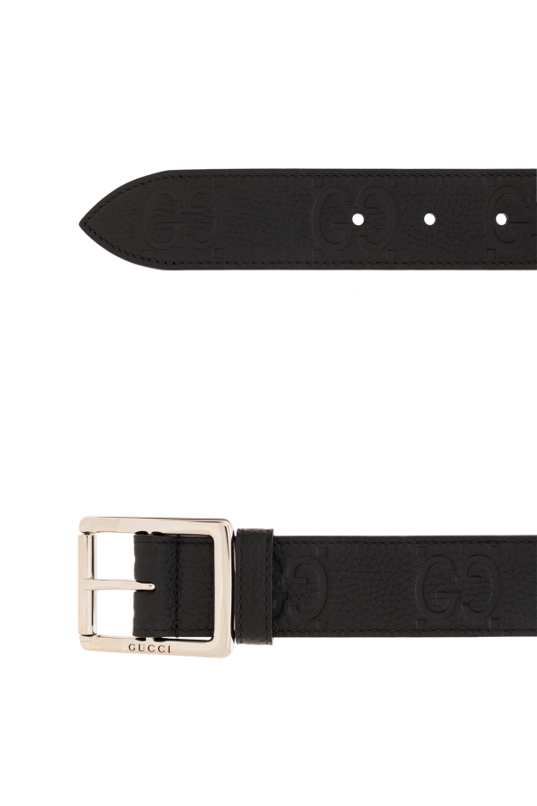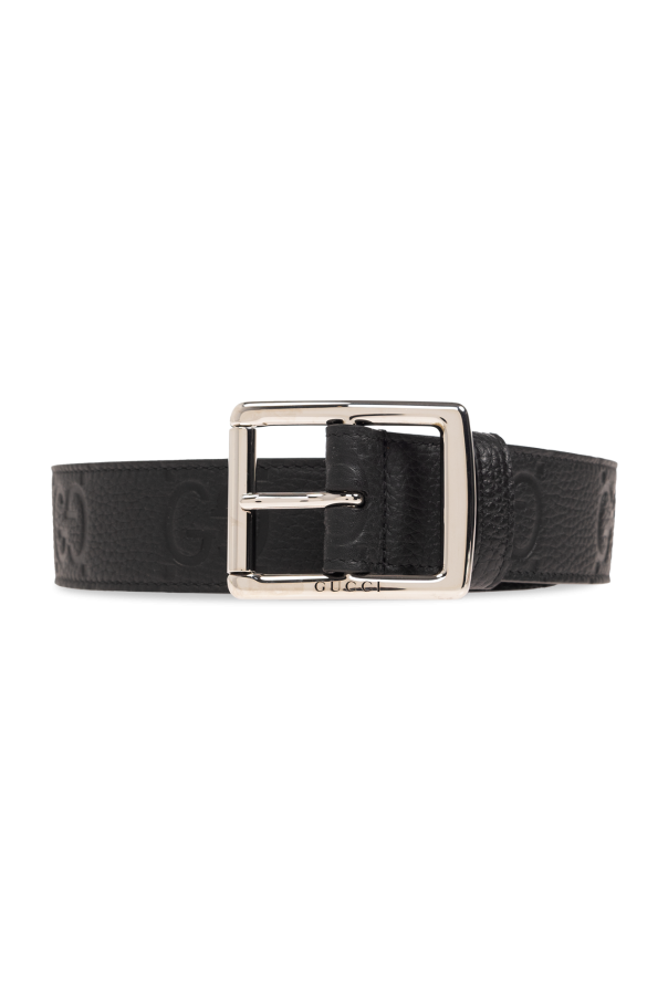Black belt from Gucci. Made of calf leather with an embossed monogram pattern, this item features a silver-tone buckle with an engraved logo.