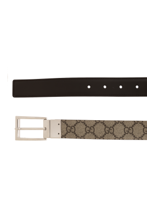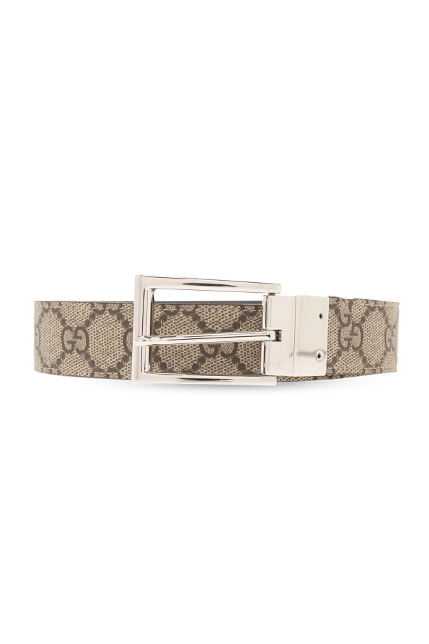 Reversible belt from Gucci. One side is made of the brand's signature ‘GG Supreme’ canvas in beige and brown. The other side is made of dark brown calf leather. The design is complete with a silver-tone buckle with an engraved logo.