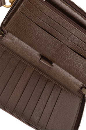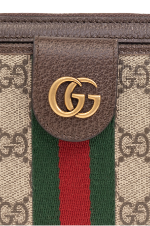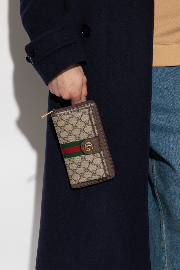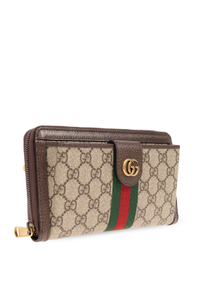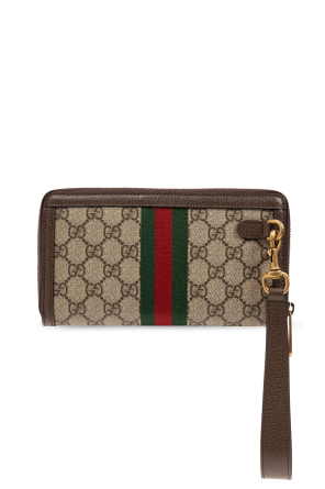 Beige and brown ‘Ophidia’ wallet from Gucci. Made of the brand's signature ‘GG Supreme’ canvas and trimmed with calf leather, this design fastens via a zip and showcases a green-red-green ‘Web’ stripe and ‘Double G’ hardware on the front. It is complete with an attached wrist strap, antiqued gold-tone metal elements and one internal compartment with one slip pocket, one zip pocket, 15 card slots and a pen holder.