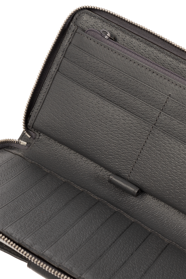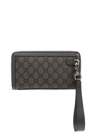 Dark grey ‘Ophidia’ wallet from Gucci. Made of the brand's signature ‘GG Supreme’ canvas and trimmed with calf leather, this design fastens via a zip and showcases ‘Double G’ hardware on the front. It is complete with an attached wrist strap, silver-tone metal elements and one internal compartment with one slip pocket, one zip pocket, 15 card slots and a pen holder.