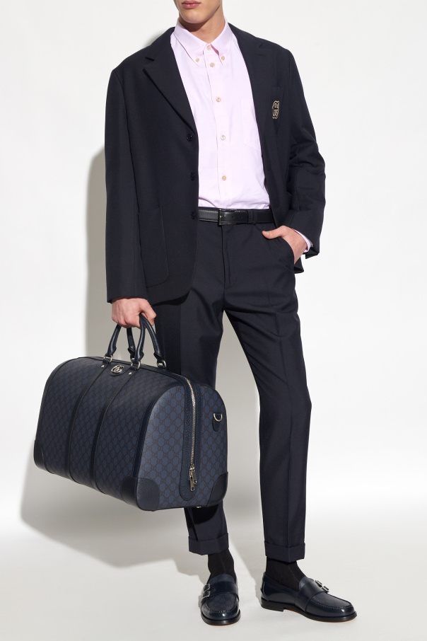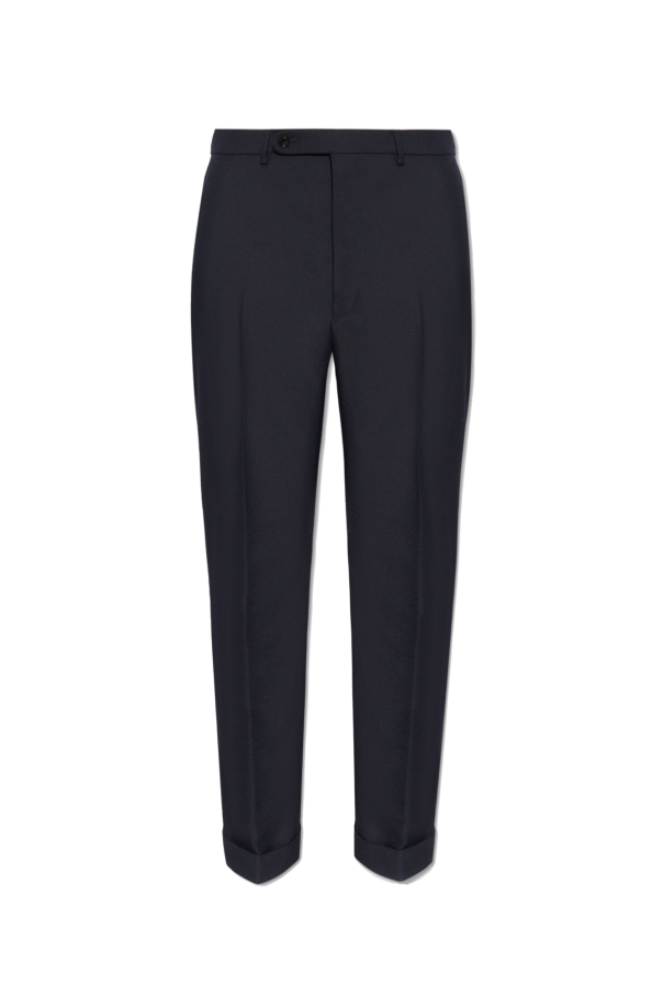 Navy pleat-front trousers from Gucci. Made from a wool blend, this pair features a zip and hook fastening, two slip pockets, two buttoned pockets and slightly tapered legs.