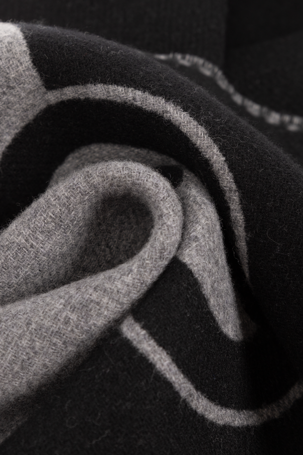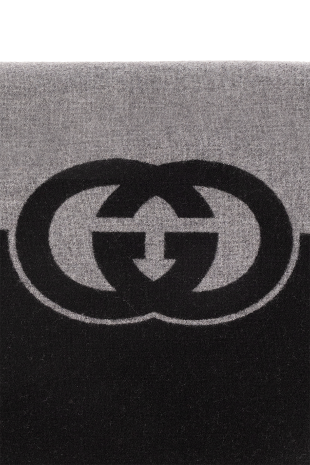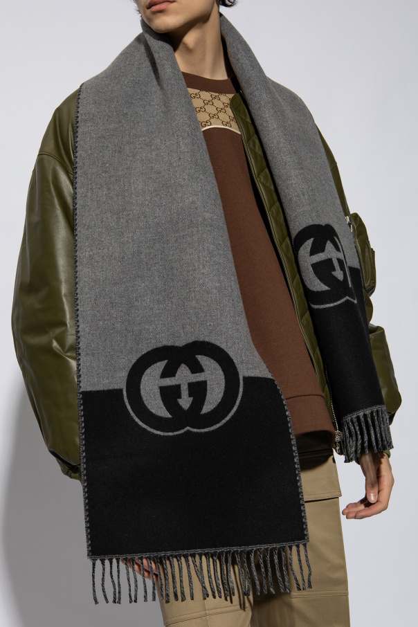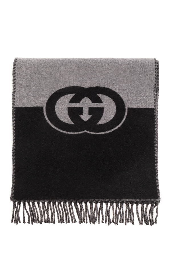 Gucci的灰黑色围巾。由羊毛和羊绒制成。饰有标志图案。配有流苏饰边。