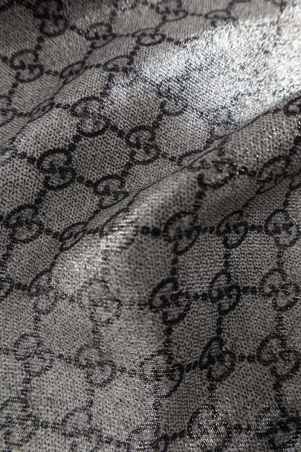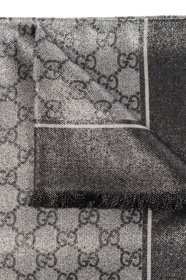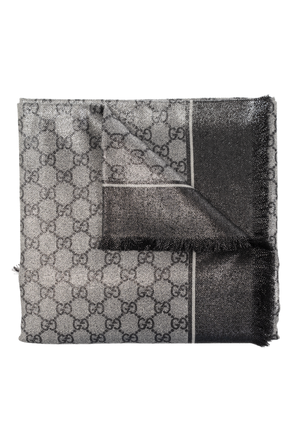 Dark grey and black shawl from Gucci. Made in shiny wool jacquard, this item showcases an embroidered monogram and fringed edges.