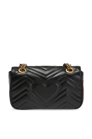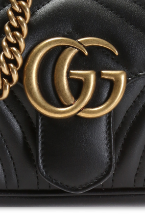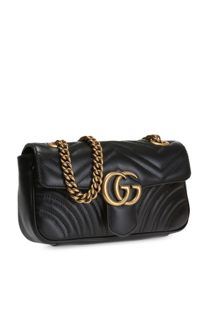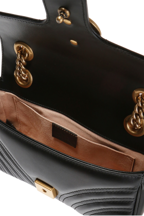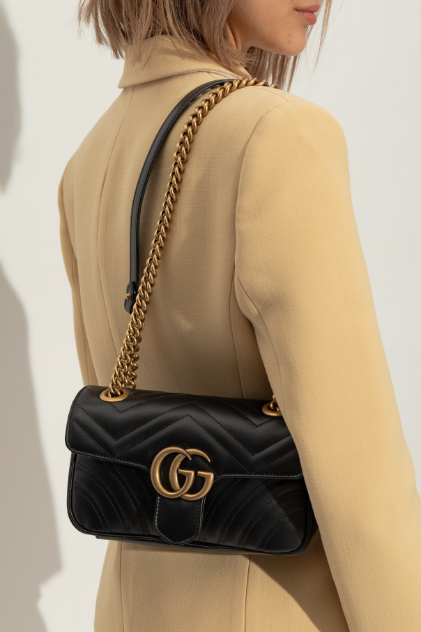 这款黑色真皮GG Marmont绗缝单肩包来自Gucci,饰以金属标识,配有插扣开合、链式提手和肩带、米色内衬。内有一个主要分层和一个侧袋。做旧金色金属配件。