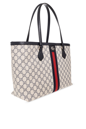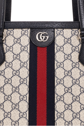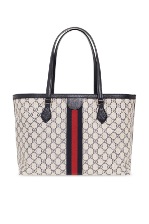 Beige and navy blue ‘Ophidia Medium’ shopper bag from Gucci. Crafted from GG Supreme canvas and trimmed with calf leather, this design secures with a magnetic fastener and features a logo application and the brand's signature navy blue and red Web stripe detailing, two half-round straps, silver-tone metal hardware and one internal compartment with one zip pocket and one slip pocket.