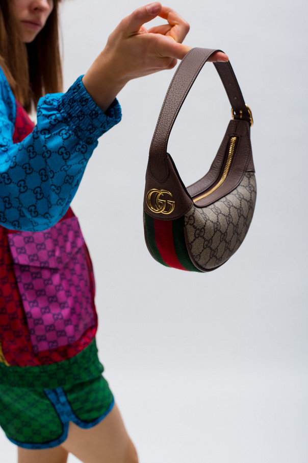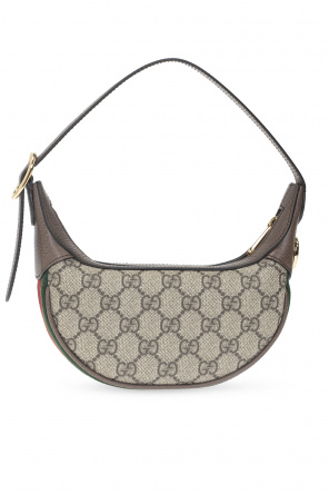 Gucci的棕色及米色Ophidia GG单肩包。迷你款式。GG Supreme帆布及皮革质。饰有拉链。附绿色及红色调Web条纹样式。侧面附logo配件。金色调金属配件。内部附一个隔层,两个卡槽,及一个饰链扣。