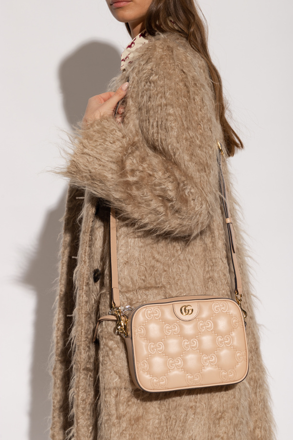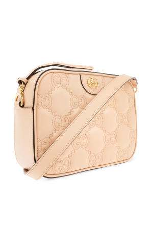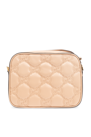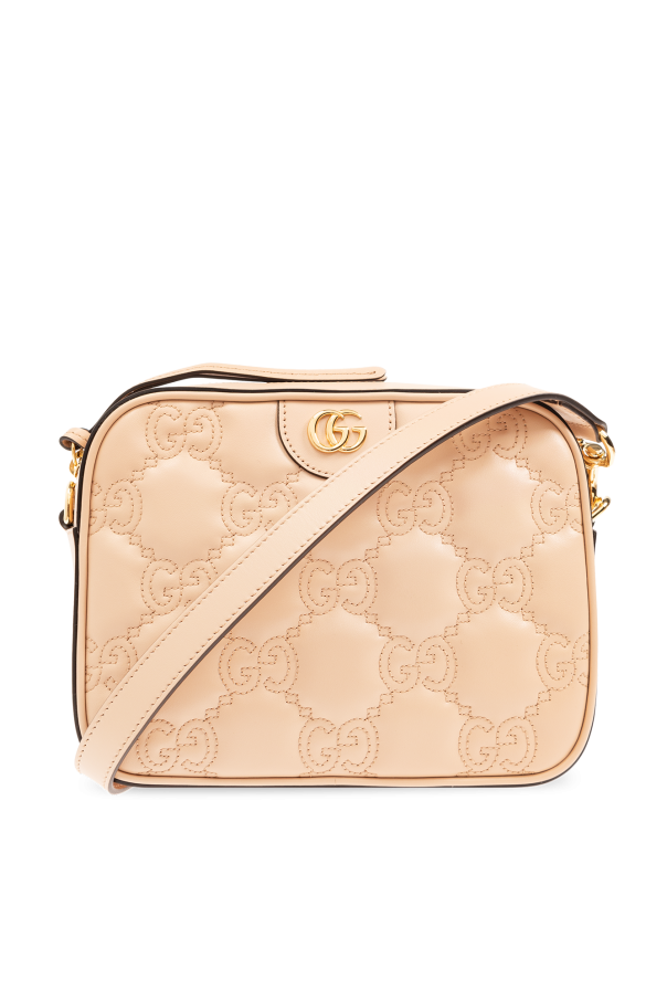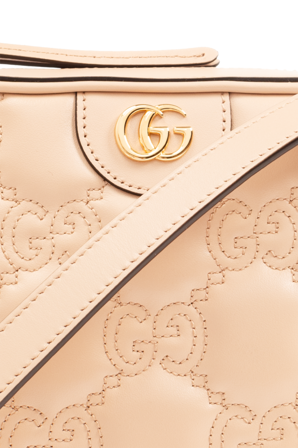 Beige shoulder bag from Gucci. Made of soft ‘GG Matelasse’ leather decorated with a quilted monogram pattern, this design fastens via a zip and showcases Double G hardware on the front. It is complete with detachable and adjustable straps (a beige one in nylon and a leather one), gold-tone metal elements and one internal compartment.