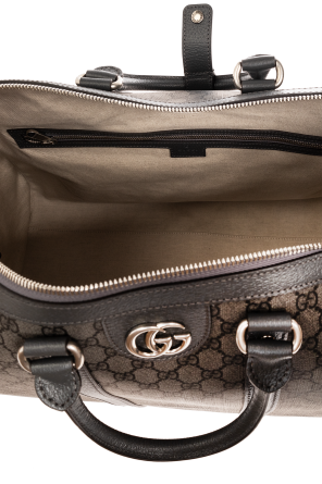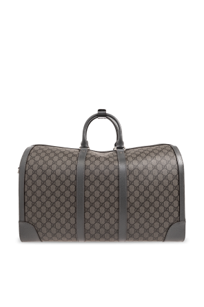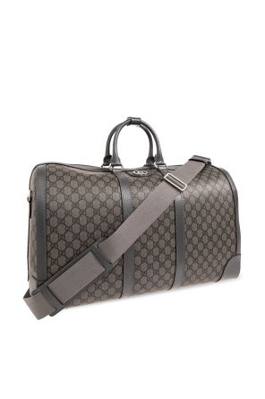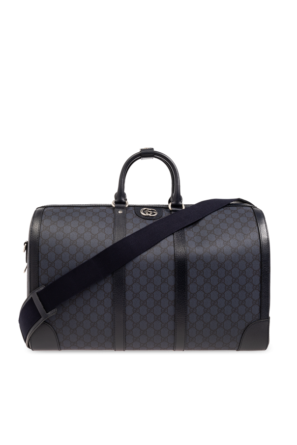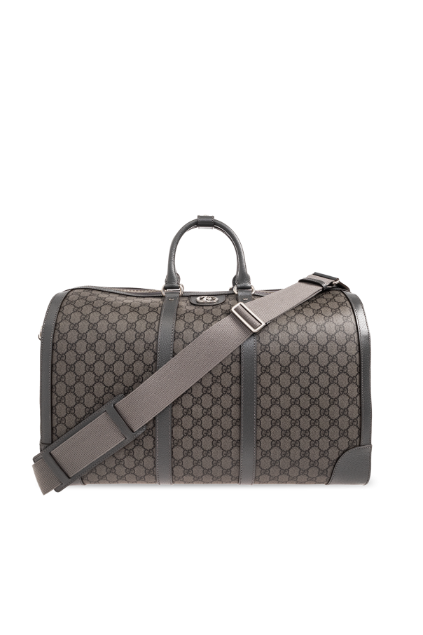 Gucci的深灰色Ophidia Large旅行包,采用品牌标志性的GG Supreme帆布和小牛皮制成。双拉链开合。饰有金属Double G标志。两个半圆形手柄通过按扣带连接。可调节的可拆卸肩带。内部配有带有两个拉链口袋的主隔层。银色金属配件。附带:一个挂锁和两个可拆卸吊饰,一个带隐藏钥匙的吊饰,一个用作身份标识的吊饰。