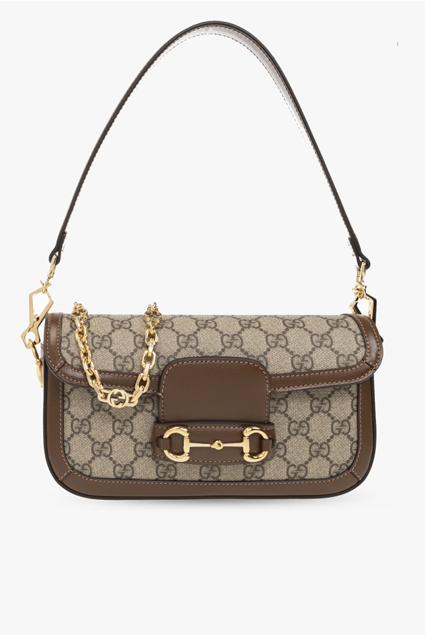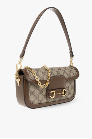 Beige and brown ‘Horsebit 1955’ shoulder bag from Gucci. Crafted from ‘GG Supreme’ canvas and calf leather, this design features a sliding closure, the brand's signature horsebit hardware on the front, a detachable handle and chain strap accentuated with ‘Interlocking G’ details, gold-tone metal elements and one internal compartment.