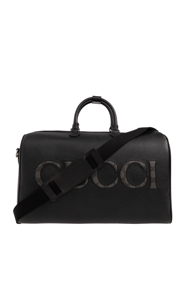 Black duffel bag from Gucci. Size medium. Crafted from calf leather, this design fastens via a two-way zip and showcases the brand's logo made of GG Supreme canvas, two half-round handles connected with a snap strap as well as a detachable and adjustable shoulder strap and one internal compartment with a zip pocket. Comes with a silver-tone padlock, an ID tag and a keyed charm.