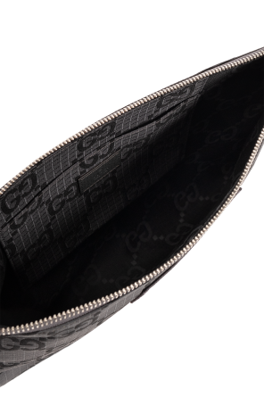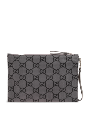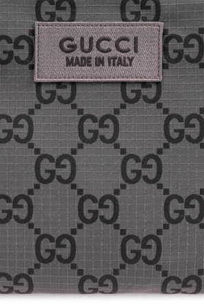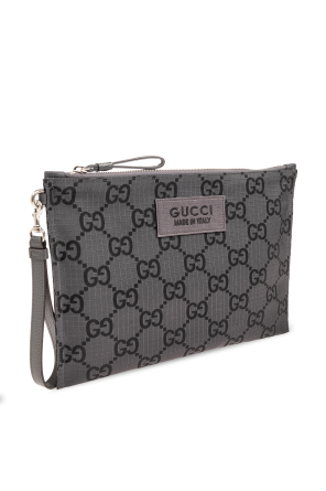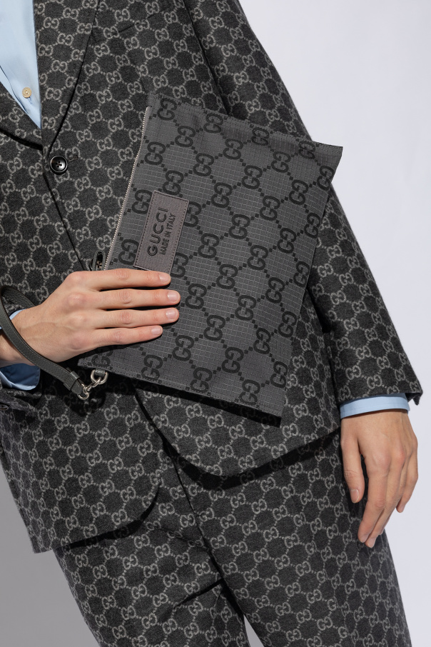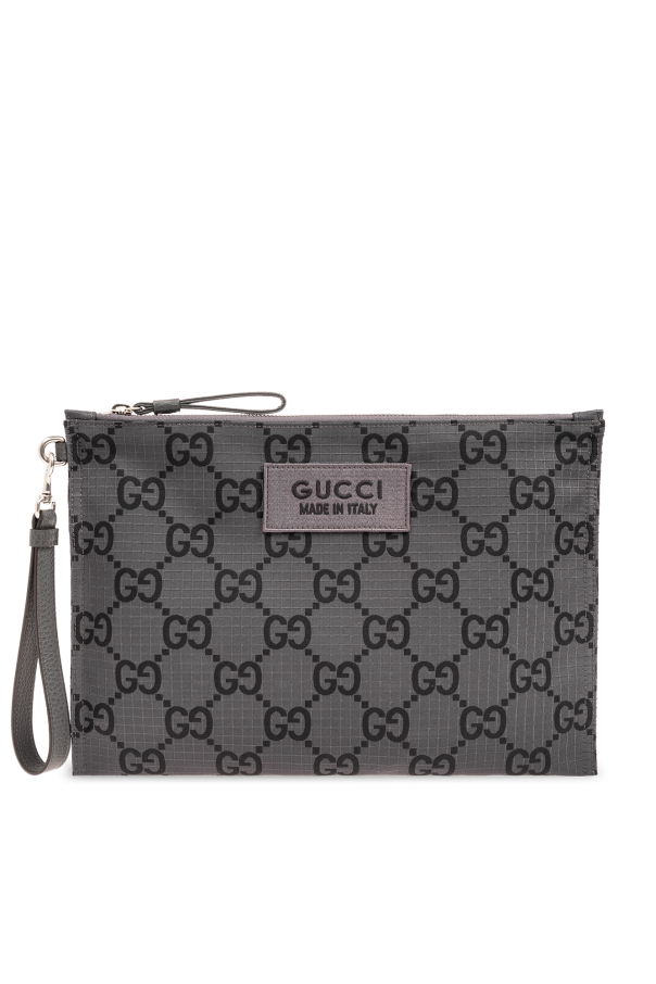 Dark grey handbag from Gucci. Crafted from technical material decorated with a monogram motif, this design fastens via a zip and showcases a logo patch on the front, a detachable wrist strap, silver-tone metal elements and one internal compartment with a slip pocket.