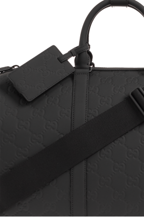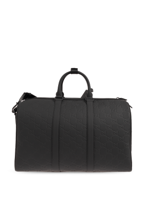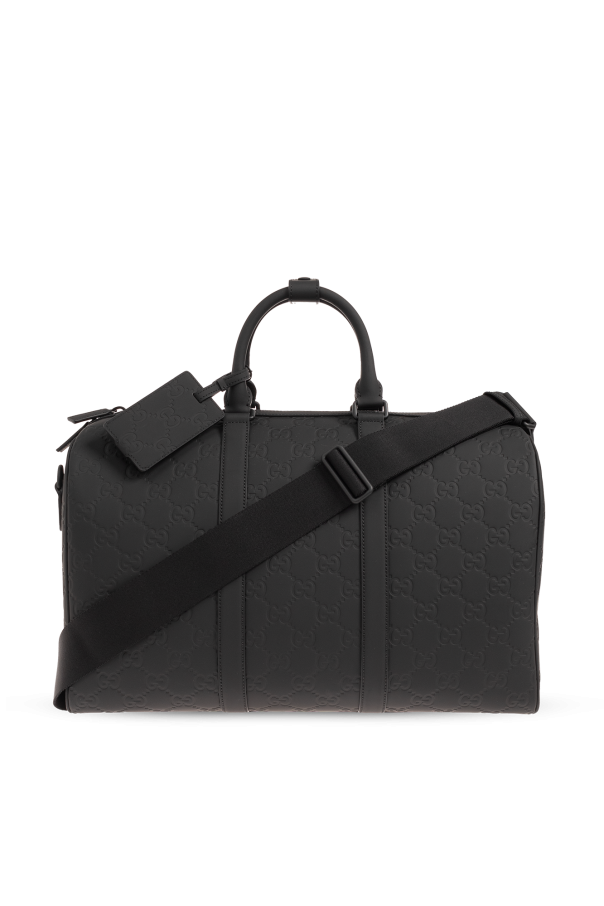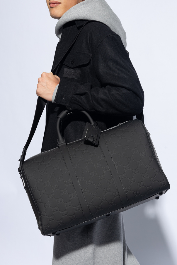 Black ‘Duffle Medium’ handbag from Gucci. Crafted from calf leather with rubber coating, this design fastens with a two-way zip and is embossed with a monogram pattern. It is complete with two snap-fastened handles, detachable and adjustable shoulder strap, detachable ID tag and one internal compartment with two zip pockets.