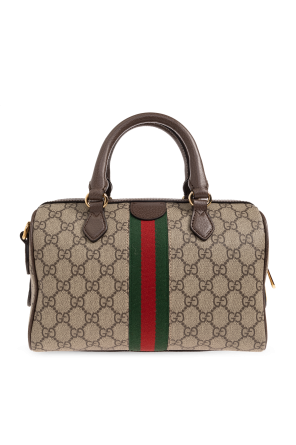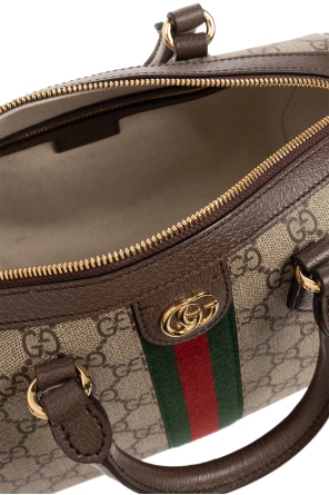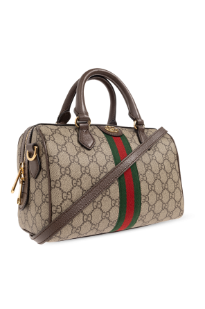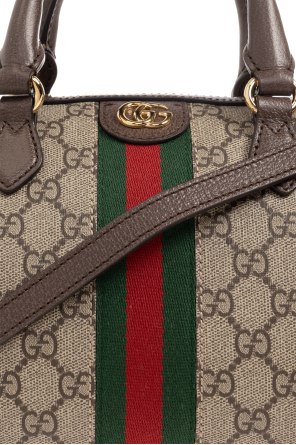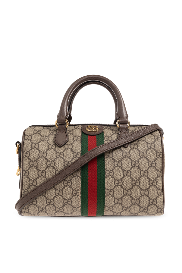 Gucci的米色和棕色Ophidia Small单肩包。采用品牌标志性的GG Supreme帆布和小牛皮制成。双向拉链开合。饰有绿红绿色Web条纹细节和双G标志贴饰。配有两个半圆形手柄和可调节的可拆卸肩带。内部设有带拉链口袋的主隔层。金色金属配件。