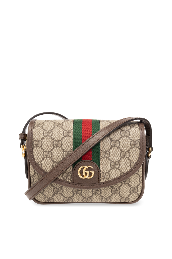 Beige and brown ‘Ophidia GG Mini’ shoulder bag from Gucci. Made of ‘GG Supreme’ canvas and trimmed with leather, this design secures via a magnetic fastener and zip and features a logo-shaped application accompanied by the brand's signature green-red-green ‘Web’ stripe on the front. It is complete with a long and adjustable shoulder strap, gold-tone metal hardware and one internal compartment with two zip pockets.