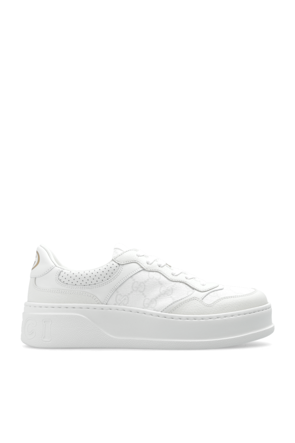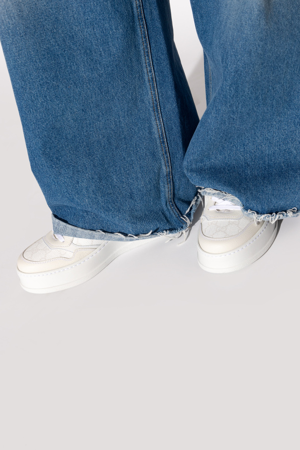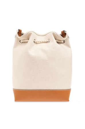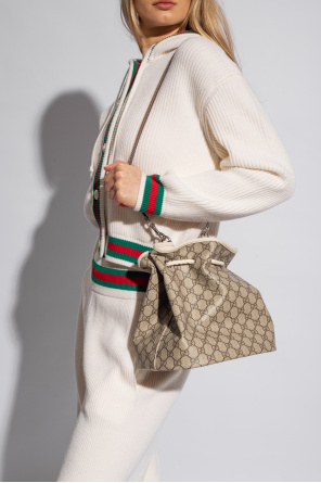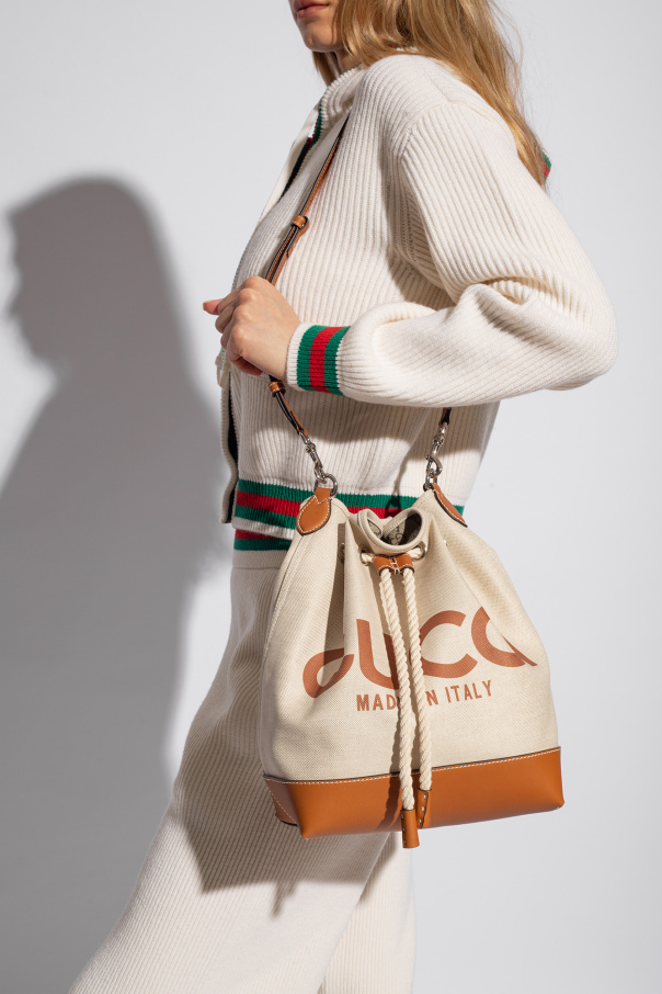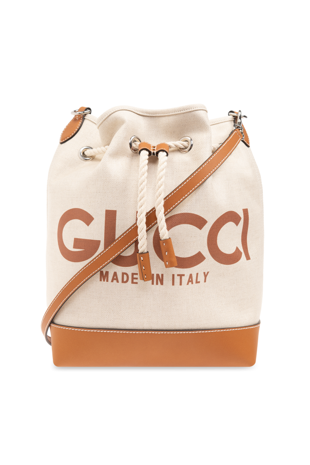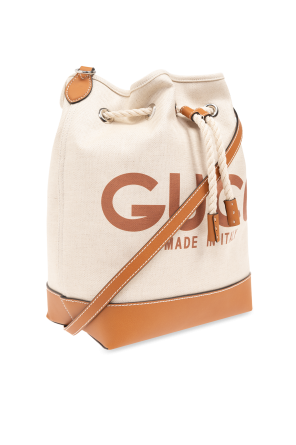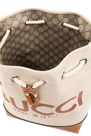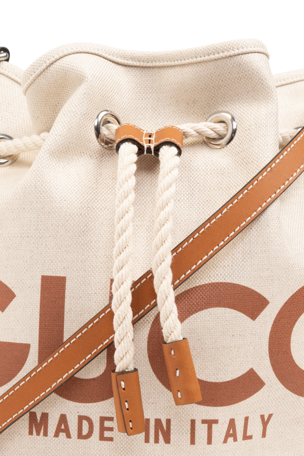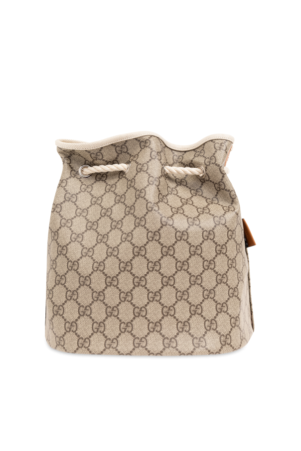Gucci的双面米色双面水桶包。一面采用帆布和棕色小牛皮饰边。抽绳设计。正面饰有标志。可拆卸肩带。另一面采用GG Supreme帆布。内部设有一个主隔层。银色金属配件。