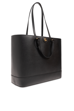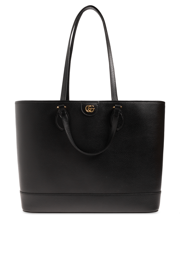 Gucci的Ophidia Medium黑色托特包,采用皮革制成。正面饰有金属logo饰片。四个手柄。内部设有一个主隔层。金色金属配件。