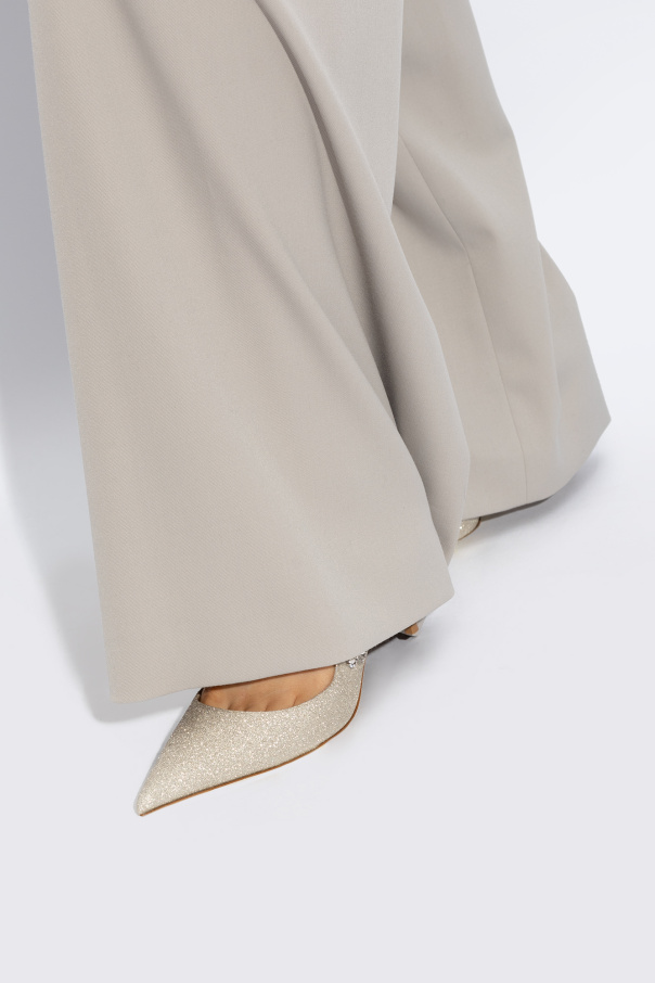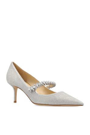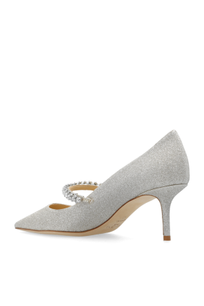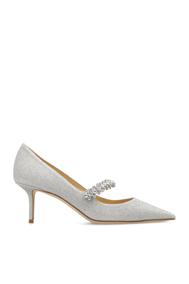 Light gold-tone ‘Bing’ pumps from Jimmy Choo. Made of fabric with a glitter finish, this design features a strap with a crystal detail, pointed toe and beige leather sole.