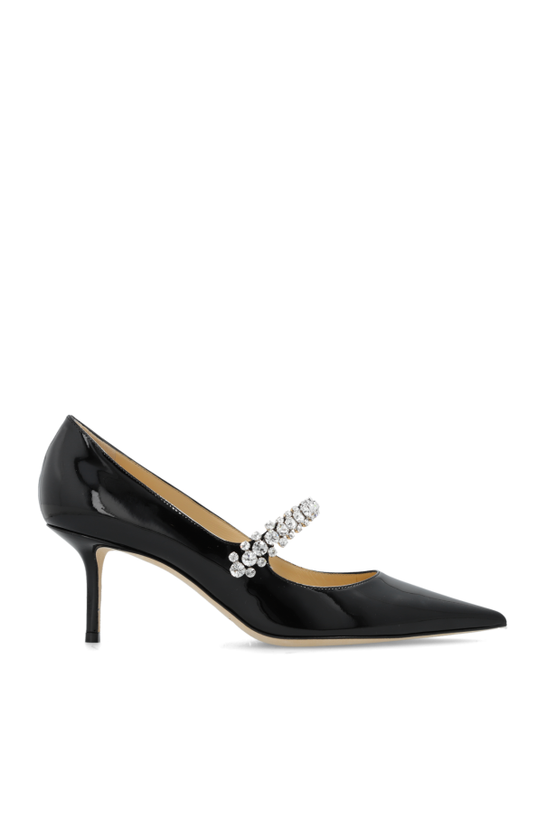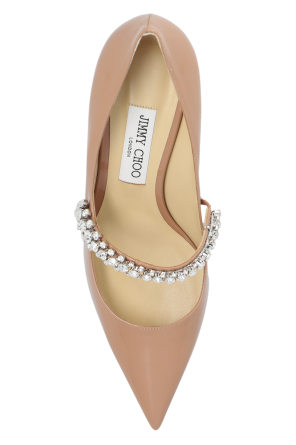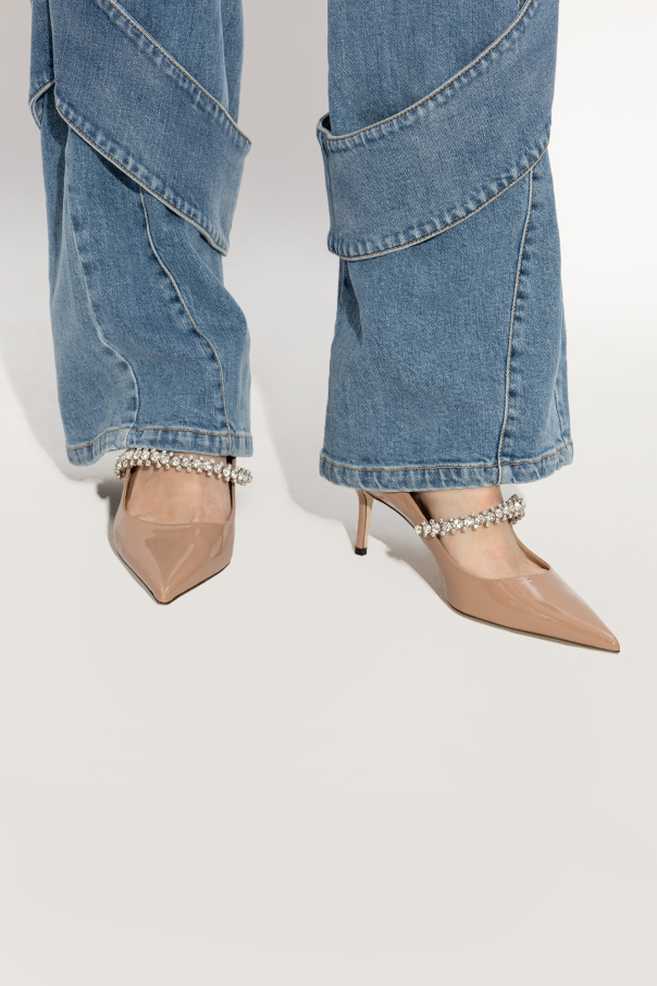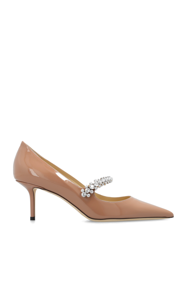 Jimmy Choo的米色Bing漆皮高跟鞋。采用皮革制作。前部饰有水晶镶嵌细带。尖头设计。米色皮革鞋底。