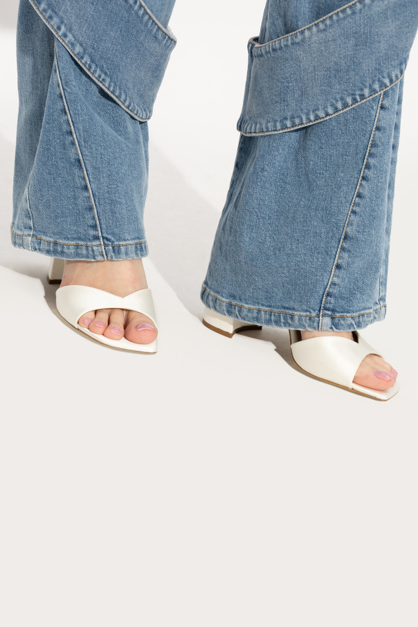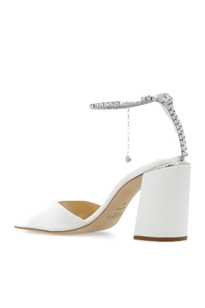 Jimmy Choo的白色Saeda缎面高跟凉鞋。可调搭扣踝带。方头。奶油色皮革鞋底。