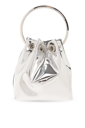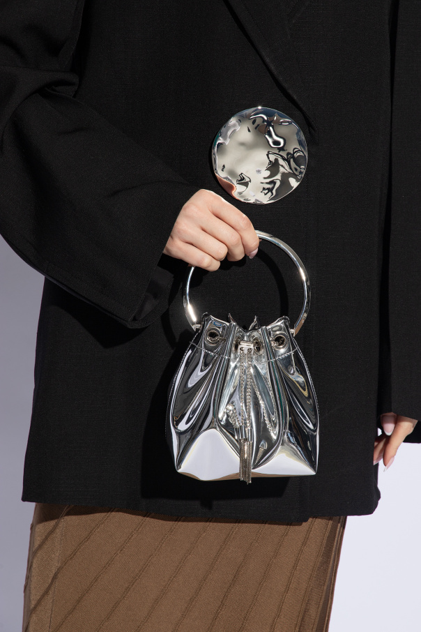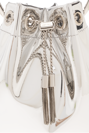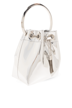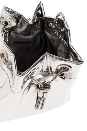 Jimmy Choo的银色Bon Bon水桶包。采用镜面效果仿皮材质制成。抽绳设计。正面饰有压花标志。半圆形硬挺提手。长链条。内部设有一个主隔层和一个卡位。银色金属配件。