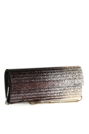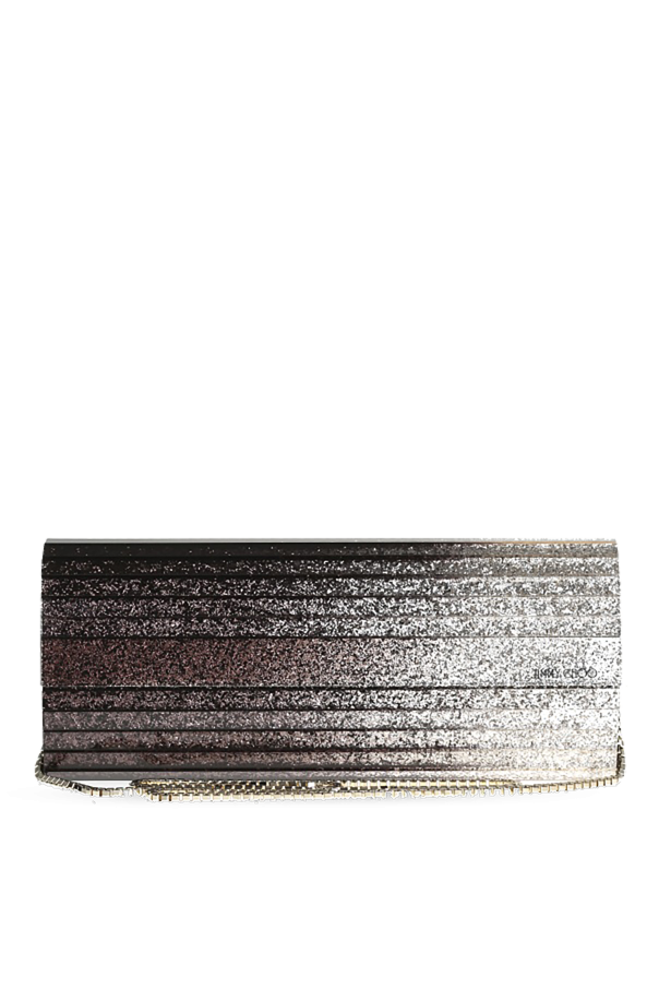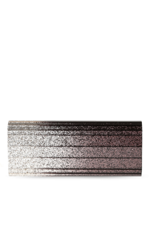 Glittery violet and silver-tone shaded acrylic oblong 'Sweetie' clutch from Jimmy Choo with snap fastening. Small logo on the front. Long metal shoulder chain. Slip pocket inside.