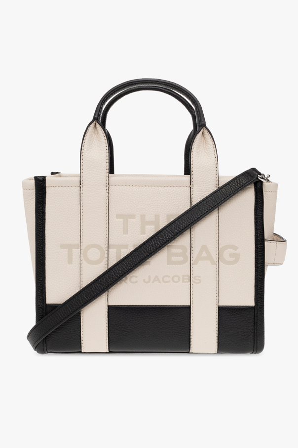 Cream and black ‘The Tote Mini’ shopper bag from Marc Jacobs. Made of grained leather, this model is complete with a zip fastening, embossed logo on the front, patch at the back, two half-round handles, detachable, adjustable shoulder strap, silver-tone metal hardware and one internal compartment with one slip pocket.
