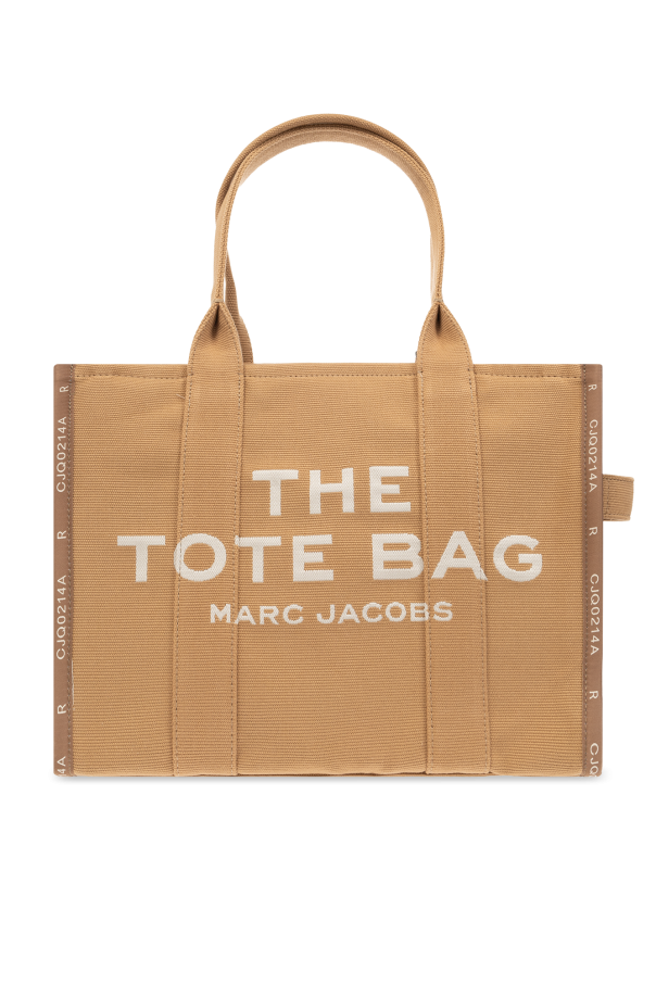 Beige ‘The Tote Large’ shopper bag from Marc Jacobs. Made of canvas, this design fastens with a zip and is decorated with a logo embroidery on the front, patch at the back and decorative trimming to the sides. It is complete with two half-round handles, gold-tone metal hardware and one internal compartment with two slip pockets and one zip pocket.
