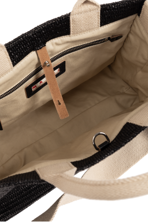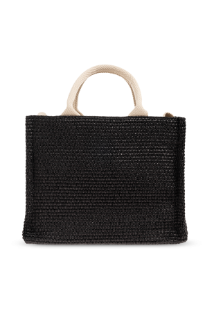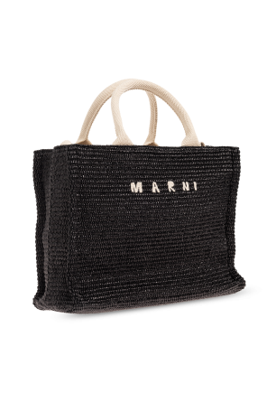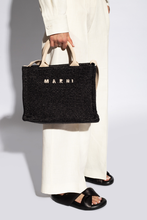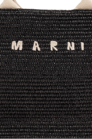Black shopper bag from Marni. Size small. Made of faux raffia, this design features a strap fastening, cream logo embroidery, two half-round handles, shoulder strap, silver-tone metal hardware and one internal compartment with one zip pocket.