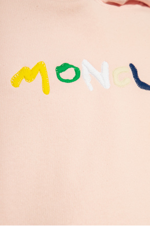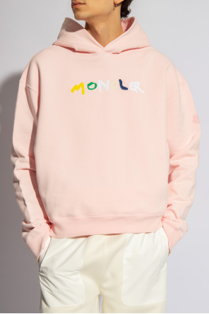 Moncler的浅粉色连帽衫。采用棉质面料制成。正面饰有彩色刺绣标志。袖子上有字母图案贴花。两个插袋。长袖和下摆设有松紧饰边。