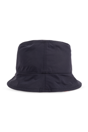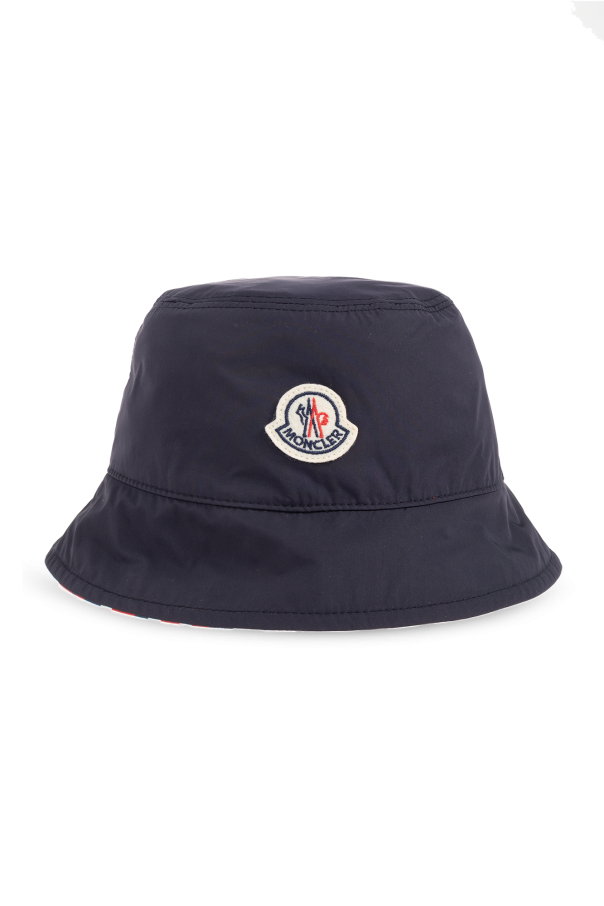 Moncler的双面渔夫帽。一面为深蓝色,另一面饰有红白蓝色字母图案。