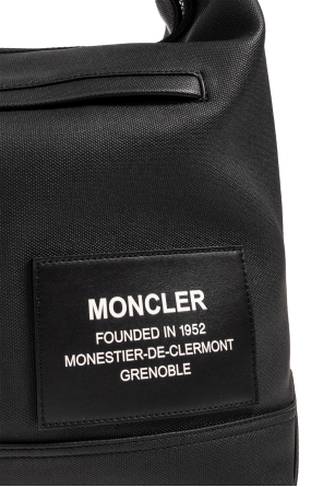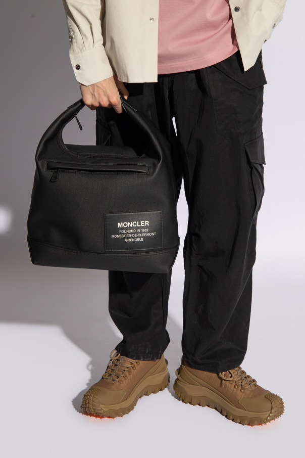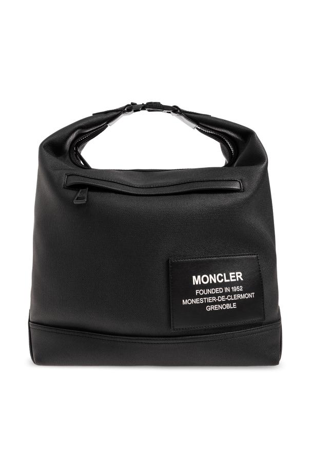 Black ‘Nakoa’ handbag from Moncler. Made from coated fibre with waterproof properties, this design fastens via a zip and showcases a black and white logo patch on the front, one half-round handle with a magnetic snap, two removable shoulder straps, black metal hardware and one internal compartment with a zip pocket.