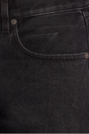 Off-White的黑色破洞牛仔裤。纽扣开合。后部饰有标志贴花。五个插袋。长裤腿,略锥形。