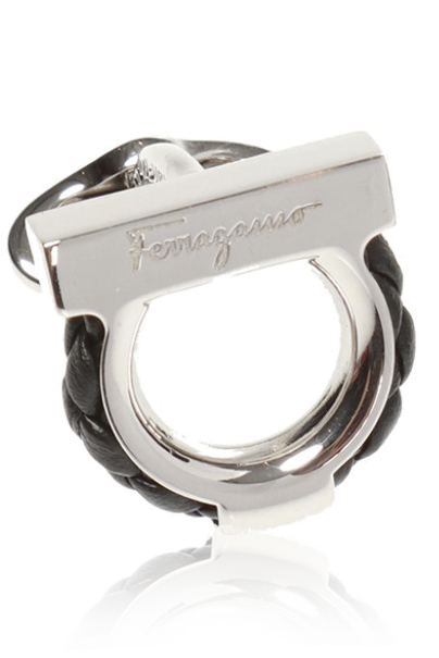 这款银色Gancini图案袖扣来自Salvatore Ferragamo,饰以压花标识与黑色编织小牛皮细节。