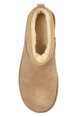 UGG的米色Classic Ultra Mini Platform羊皮雪地靴,采用双面羊皮麂皮制成。后部饰有标志贴花。100%回收纤维制成的纺织鞋口。UGGplush™内衬。Treadlite by UGG™米色EVA泡沫外底。
