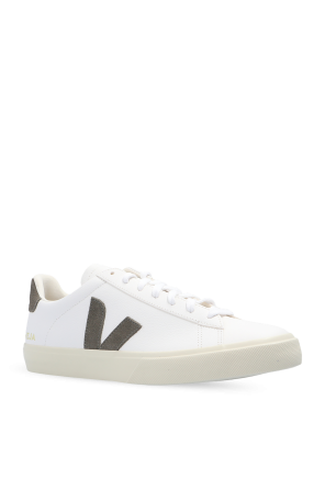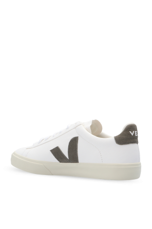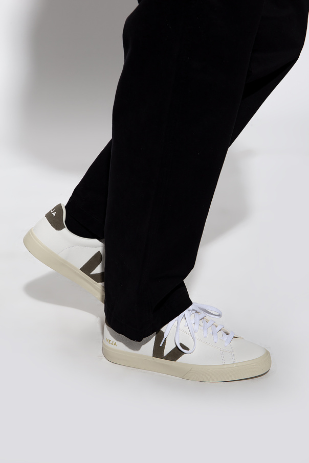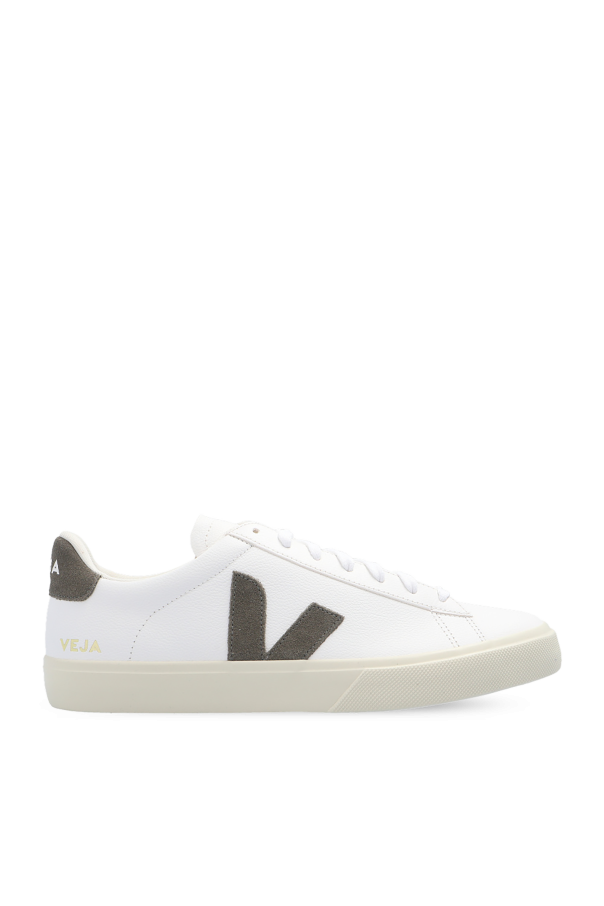White ‘Campo’ sneakers from Veja. Crafted from chrome-free leather, this lace-up model features an embossed logo on the tongue, the brand's signature khaki logo patch in rubber and vegan suede and organic cotton shoelaces. The mesh inner lining made from recycled materials was developed to acquire a better resistance to friction. The organic-sourced and recycled insole consists of sugar cane, Amazon rubber, organic cotton and recycled EVA. It is set on a cream rubber sole made from organic and recycled materials. This leather undergoes an innovative tanning process where no chrome, heavy metals or dangerous acids are involved. By simplifying the tanning process, the use of chemicals and energy is limited, the use of water is reduced by about 40% and the use of salt by 80%. After tanning, the water is recyclable.