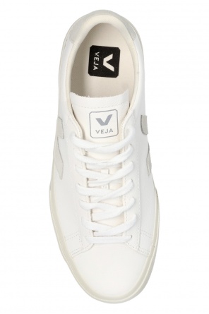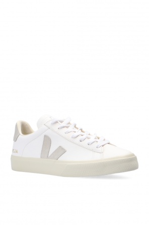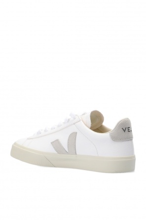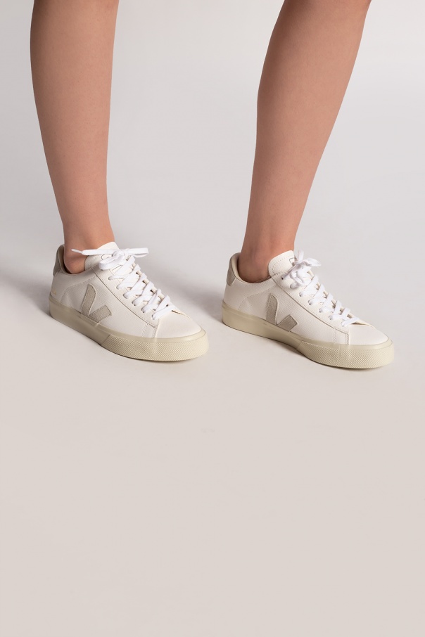Veja的白色Campo运动鞋。无氯皮革质。附系带。浅蓝色绒面革质logo贴片。背面饰有栗色图案。奶油色橡胶鞋底。
