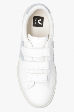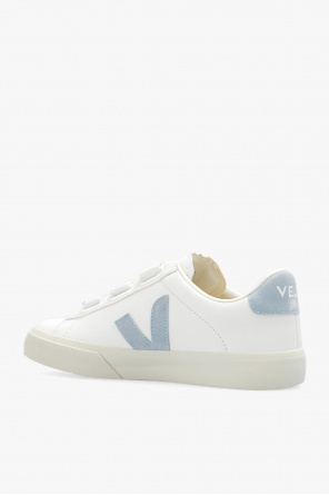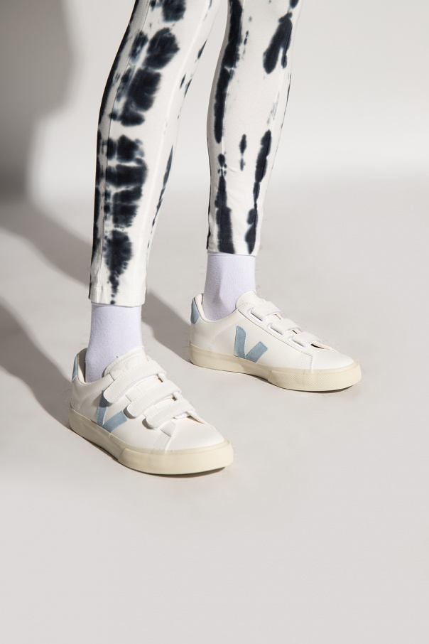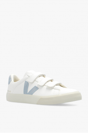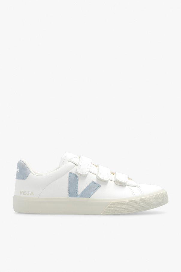 White and light blue ‘Recife’ sneakers from Veja. Made of suede, this pair features velcro fastening, embossed logo on the tongue and a light blue V patch made of rubber and rice waste. The mesh inner lining made from recycled materials was developed to acquire a better resistance to friction. The organic-sourced and recycled insole is made from sugar cane, Amazon rubber, organic cotton and recycled EVA foam. Rests on a cream rubber sole made of organic and recycled materials.