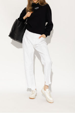 White and light grey ‘V-12 B-Mesh’ sneakers from Veja. Crafted from a ‘B-Mesh’ derived from recycled bottles and suede, this lace-up model sits on a cream and brown rubber sole made of organic and recycled materials and is enriched by a printed logo on the tongue, organic cotton laces and a white V patch made of rubber and rice waste. The mesh inner lining made from recycled materials was developed to acquire a better resistance to friction. The organic-sourced and recycled insole is made from sugar cane, Amazon rubber, organic cotton and recycled EVA foam.